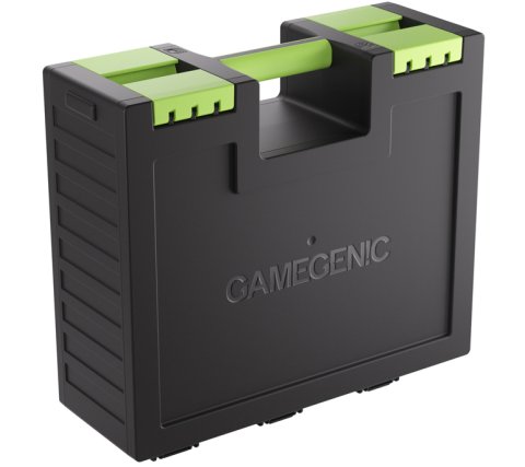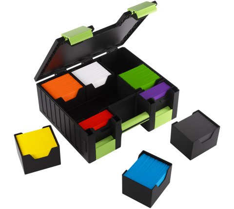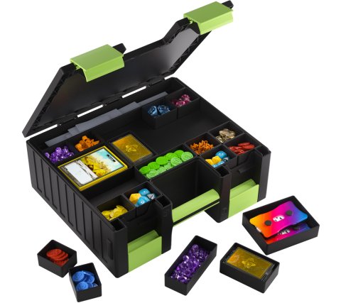 800 single-sleeved cards. The accessory side includes 19 removable trays in five different sizes. Perfect for dice, tokens, counters, and other accessories. The trays are interchangeable with the Gamegenic Token Silo and the Token Silo Cards Add-on.