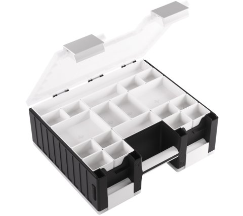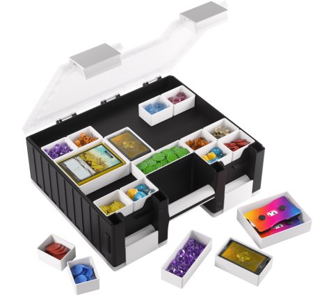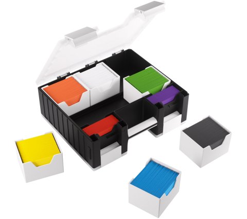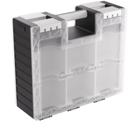 The case consists of two sides, the card side and the accessory side, which can be opened independently. The card side contains six removable card holders, each holding 100 double-sleeved cards in extra-thick Gamegenic sleeves. In total, the card side can hold 600 double-sleeved or 800 single-sleeved cards. The accessory side includes 19 removable trays in five different sizes. Perfect for dice, tokens, counters, and other accessories. The trays are interchangeable with the Gamegenic Token Silo and the Token Silo Cards Add-on.