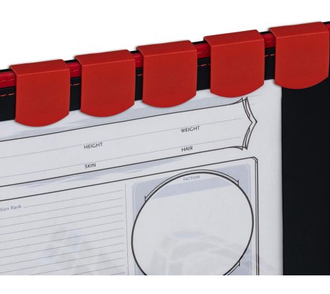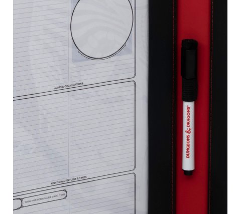 Het Premium Dungeon Master's Screen heeft overal aangedacht en maakt het jouw leven als Dungeon Master een stuk aangenamer met allerlei gemakken en slimmigheden. Het scherm is gemaakt van hoogstaand kunstleer geborduurd met rode letters en bestaat uit vier panelen. Ieder paneel heeft ruimte voor papier van 21,6 bij 28,0 centimeter (US Letter) en wordt afgedekt met een plastic voorzijde zodat je gemakkelijk aantekeningen kan maken met de bijgeleverde whiteboard marker. De kunststof clips houden alles gemakkelijk op hun plaats. Naast dit alles bevat het scherm ook vier vellen met herbruikbare stickers te gebruiken tijdens je avonturen.